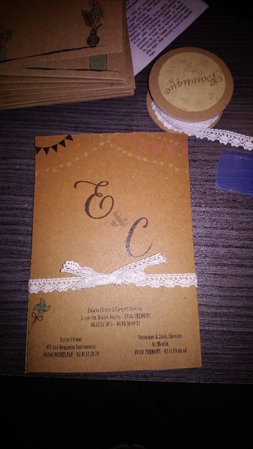 Voici en avant première nos faire parts... Il reste à fermer avec la date en fanions accroché avec ruban de dentelle. Vous trouvez ça comment ? C'est ma cousine infographiste qui les faits. On les voulait en avance pour prendre le temps de les...
