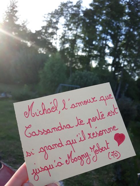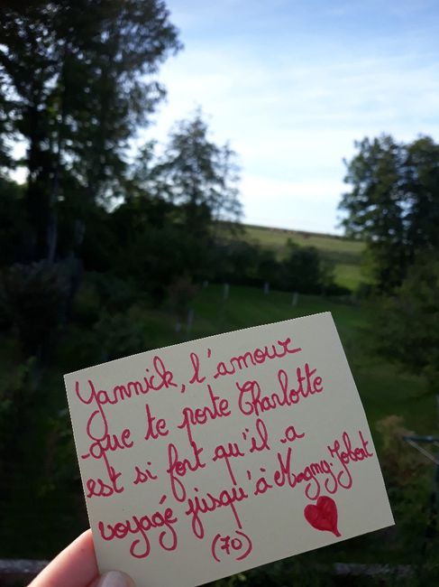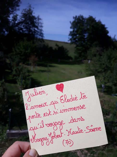 Bonjour à tous je me marie le 16/05/2020 , pourriez-vous me faire une love note avec " Franck , l'amour que te porte Émilie est si fort qu'il voyage jusqu'à ( département ou pays ) ❤️❤️. ( Écris à la main svp )Il m'en manque énormément .......Je...