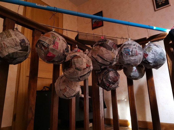Apres 4 h de travail en ce Dimanche aprÚs midi, mes 15 boules sont faites.... Plus qu'à attendre qu'elles sÚchent et ensuite on s'attaque aux fleurs en papier crépon à mettre dessus pour faire des boules de fleurs.... Pour l'instant on dirait plutÎt...