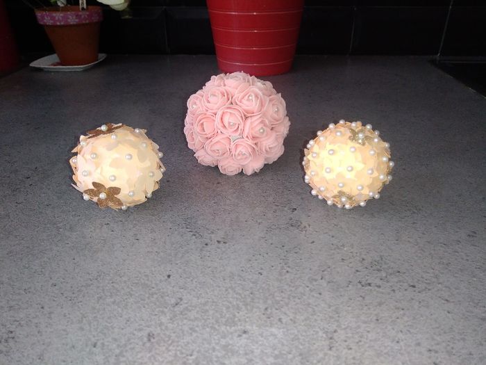 Coucou, ça fait longtemps que je n'ai pas posté. Alors voilà je cherche à faire des boules pour chaque invité, avec leur prénom. Vois en pensez quoi?? Mon idée de base était les petites boules avec les fleurs papiers mais je trouve que ça fait...