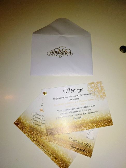 Coucou, voila des photos de mes faires parts assemblés, accompagné de leurs enveloppes. Fait sur canva, imprimer sur prixaprinting. Super contente du résultat.🥰