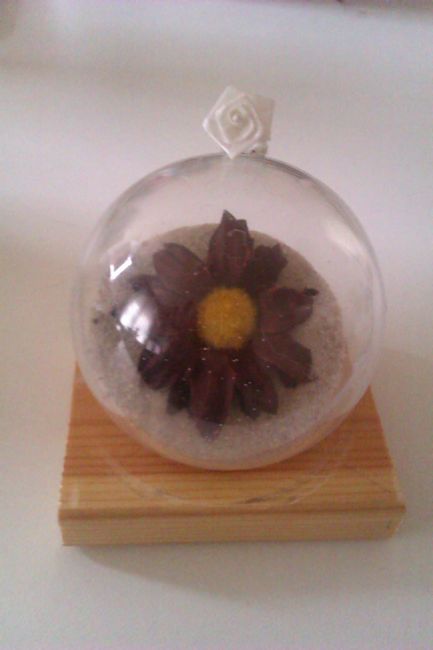 voici un essai d'une partie de notre déco de table, des boules en plexis avec du sable chocolat et des fleures en origami ivoire, et nous en feront également avec du sable ivoire et des fleures chocolats comme sur la dernière photos. Elles seront sur...