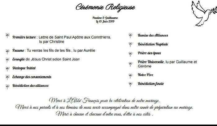 Coucou, nous nous marions dans 14 jours à l'église. Nous n'avons pas voulu faire un livret de messe de 14 pages lool ( un peu feignant pour le coup 😂😂) Du coup, nous avons fait juste le déroulé de la cérémonie en toute simplicité Vous en pensez quoi...