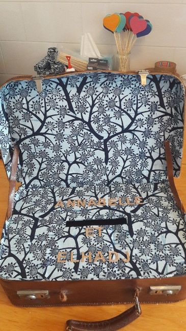 Voici notre urne qui commence à ressembler à quelque chose! Je suis trop contente de ce quon est entrain de faire de cette vieille valise!! Notre mariage franco-guinéen sera aux couleurs des tissus africains 😍😍 Allez encore 2-3 choses à ajouter et ce...