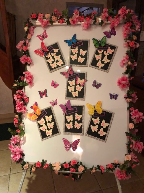 Cc voici mon plan de table sur chevalet en exclusivité hihi fait par moi même thème papillon et strass