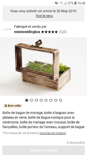 Bonjour à toutes !! Nous venons d'acheter cette belle boîte pour disposer les alliances pour la cérémonie, je l'ai trouvé sur Etsy ! Les frais de port étaient assez chers mais le coup de coeur a prit le dessus ^^ J'ai hate de la recevoir. Et vous,...