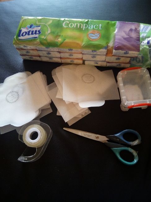 Coucou à toutes et tous! Cette après midi c'est petit bricolage ☺ des larmes de joie! Mais je ne sait pas ou mettre mon petit autocollant devant ou alors derrière pour fermé le sachet. Vous mettez combien de mouchoirs? J'avais pensée à deux? Et 50...