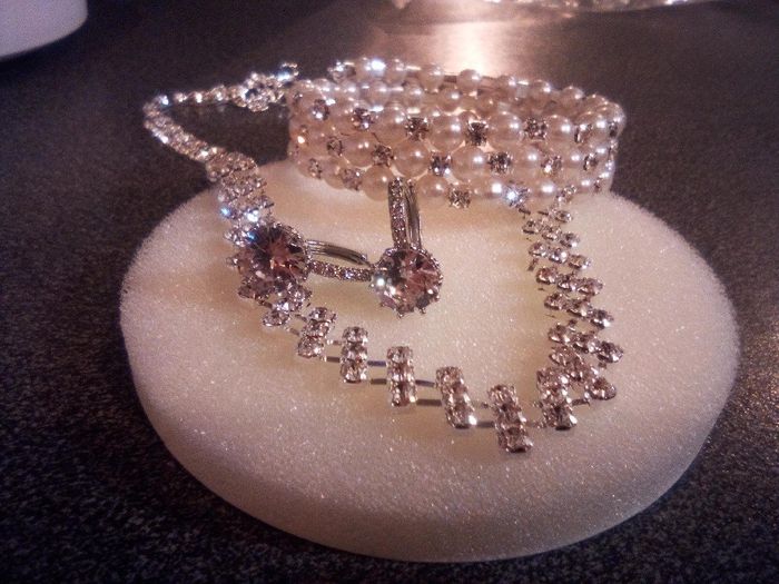 Bonjour a toutes et tous voilà ma parure de bijoux est complète ayant une robe princesse avec bustier brillant mon thème est bling chic. Quand pensez vous sashant que nous avons un petit budget l ensemble m a coûté 7€