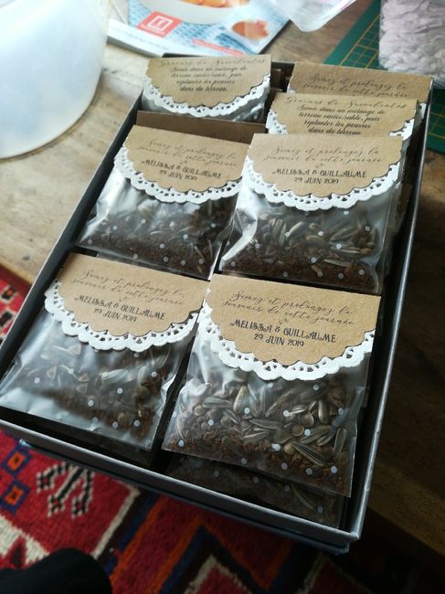 Bonjour ! Et voila a 43 jours du mariage, nos petits cadeaux invités sont presque prets ! Il me reste a coller un petit noeud blanc sur les sachets de graines, mais je ne sais pas avec quoi comme colle, mon pistolet a colle chaude est trop gros, pas...