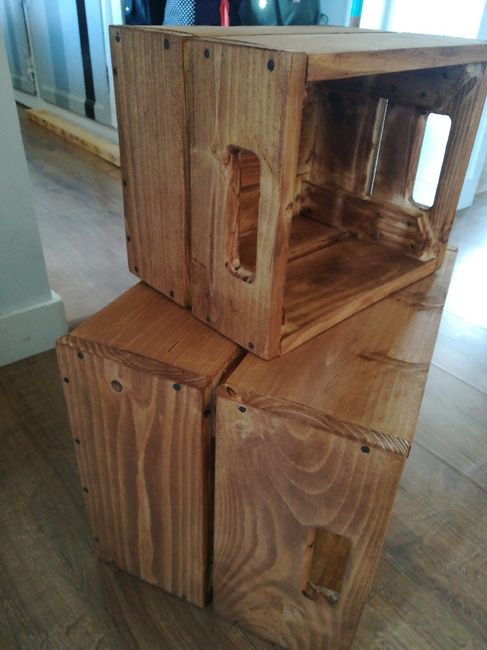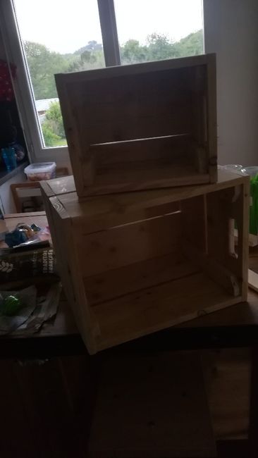 Bonjour a toutes, Après avoir été peu présentes ces derniers jours, me revoilà avec mes fameuses caisses qui serviront de déco de salle, faites par mon papa ! Jai suivi les conseils de stella (merci au passage !) en utilisant du marc de café pour les...