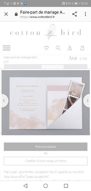 J'ai reçu ce matin le kit mariage de Cotton Bird. Il comprend : Un numero de table Un menu 3 faire-parts de styles différents Un marque place Alors la qualité a l'air au rendez-vous mais je suis un peu déçue car je leur avais demandé la possibilité...