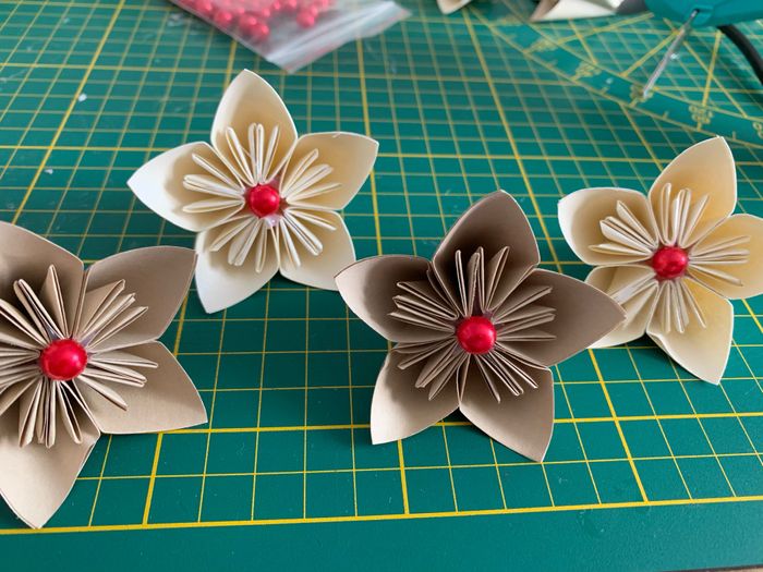 Hello la commu, aujourd’hui j’ai reçu mes perles rouges donc j’ai pu finir mes fleurs. J’en ai fait 55 pour mettre sur les tables, j’en ai fait la moitié en couleur kraft et l’autre en beige irisé (j’ai réutilisé le papier de nos faire parts). J’en...