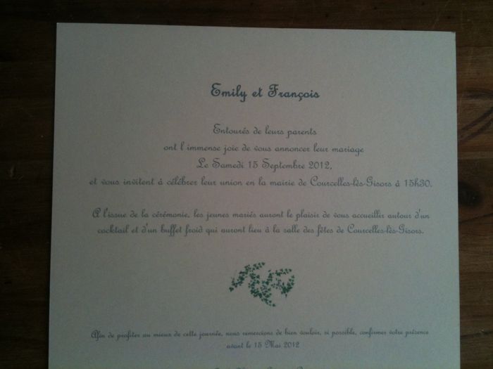 Salut à tous!! Par curisosité je me dermandais quel faire part avez vous choisi (photo)??? et quand on dit vos invités pour ceux et celles qui les ont déjà envoyés? Nous avons repéré un modele qui nous plait, simple et moderne...