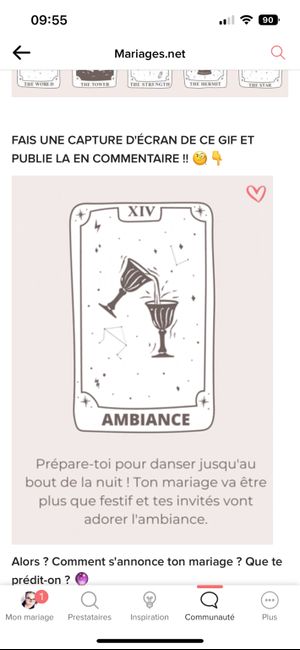 Coucou tout le monde 💜 Merci d'avoir participé jusqu'au bout ! Maintenant qu'on en sait un peu plus sur ton mariage, on va pouvoir tirer les cartes... FAIS UNE CAPTURE D'ÉCRAN DE CE GIF ET PUBLIE LA EN COMMENTAIRE !! 🧐👇 Alors ? Comment s'annonce ton...