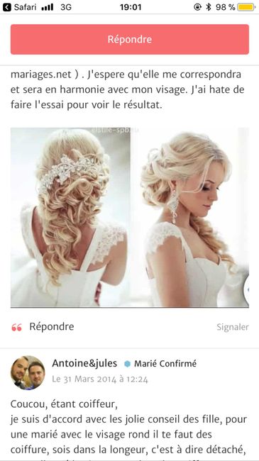 Bonjour je suis perdu je commence les essaies coiffures demain et je sait pas quoi faire jai les cheveux qui m'arrive au epaules je vait faire des rajouts et jai le visage rond je sait pas quoi faire sachant que jai un voile as acrocher et un diadem...