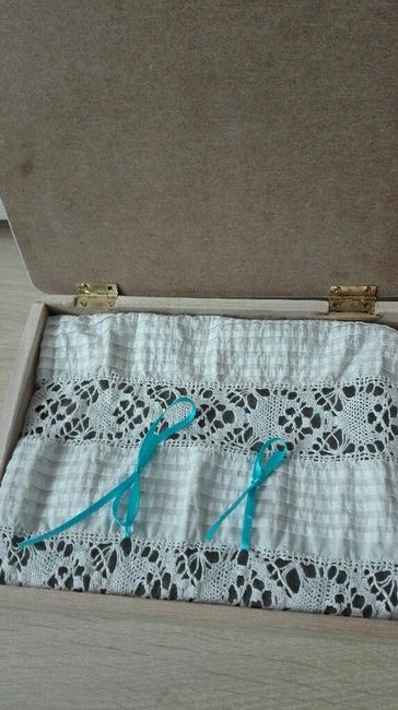 Et voici la boîte pour les alliances que notre nièce nous a apporté. Nous avons essayé de faire simple. La boîte vient de chez Gifi, la mousse vient de la « poubelle » au travail de mon mari, la dentelle a été découpée dans un jupon de ma grand-mère...