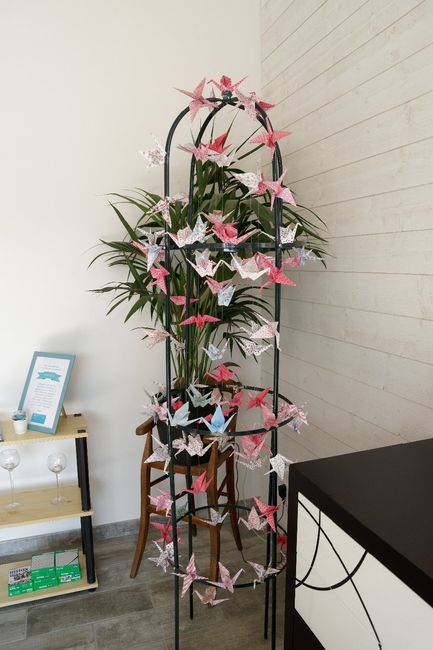 Nous avions un petit coin pour l'urne. Les paravents à l'arrière viennent d'Action avec les guirlandes Led, les deux cœurs (suspension et cœur en osier sur pied). La figurine des mariés, achetée initialement sur badaboom pour le gâteau a finalement...