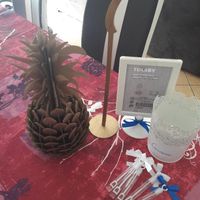 Il y a 2445 joursEchantillon de ma déco ça est j'ai commencé à m'y mettre avec l'une de mes témoins : - les numéros de table et ananas en carton recouverts de bombe dorée - les cadres supports de nom de table et les flacons de bulles de savons ornés d'un nœud en...