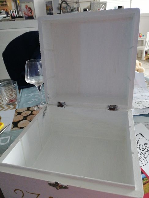 Voilà l'urne de mon fils que l'on va baptisé le jour du mariage. Qu'en pensez vous ? Les gens ouvriron la boîte pour y déposer l'argent et je pense mettre une photo de mon fils quand il a un grand sourire dedans pour remplacer le merci ( sur la...