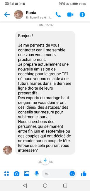 Salut les filles ! Avez vous été contacté par une productrice pour une nouvelle émission TV sur le mariage ? Moi j'ai eu un message sur Facebook et la nana me rappel demain pour discuter du projet...