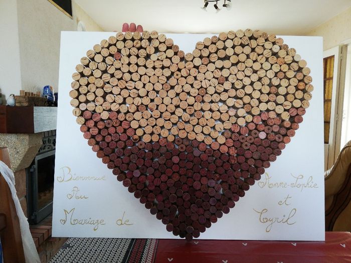 Et voilà a 3 mois du mariage j'ai avancer le plus gros de la déco : mon panneau de bienvenue !!! Eh oui, entièrement fait en bouchons de liège, j'ai reçu comme. J'ai pu les. Bouchons de rouge... Et j'ai d'abord fais le. Cœur et ensuite j'ai tout...