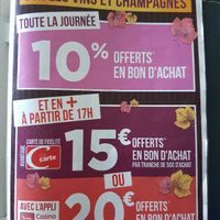 Il y a 2788 joursCoucou tout le monde, Pour toute celles et ceux qui doivent acheter vins,champagne ou autres vins mousseux, bon plan chez Geant casino ce jour (mardi 4 septembre à partir de 17h) ainsi que vendredi 6 septembre à partir de 17h -Offre de -10% sur tout...