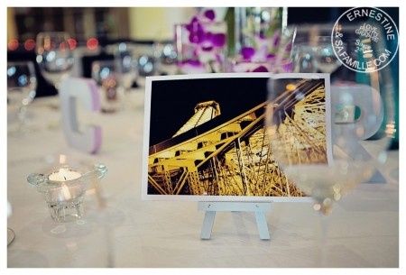 Nous voici à la salle, nous avions fait des escort cards dans des enveloppes avec une carte portant le nom de la table et une carte avec les invités présents à la même table Sur chaque table, ce n'était pas des noms mais des photos de lieux et...