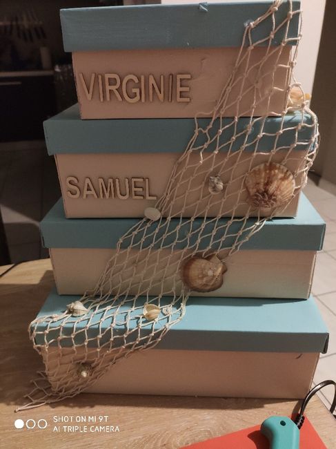 Bonjour à toutes, je voulais vous présenter notre urne. Il lui manque nos prénoms et "merci" sur la première boîte.Vous en pensez quoi? Un regard extérieur est toujours appréciable Merci