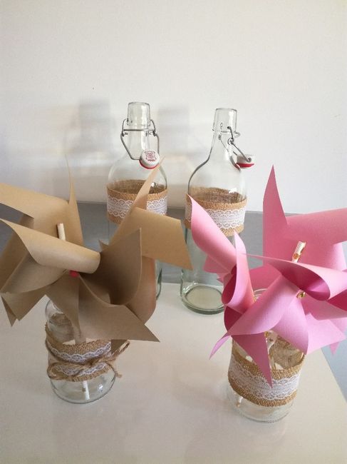 Déco champêtre, les grandes bouteilles pour la table du vin d'honneur, des pots en verre avec les moulins à vent pour la table des enfants, et les tables de invités et des mariés fleurs. Roses blanche, roses pâle, et petite verdure. Préparation de la...