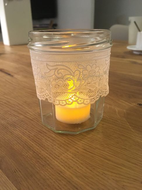 Holà ! Cet aprÚs-midi j'ai fais un essai un pot de confiture transformé en bougeoir avec de la dentelle autour, vous en pensez quoi ? C'est pour mettre au pied des bancs dans l'église, un banc sur deux.. Une fleuriste m'a donné cette idée j'ai trouvé...