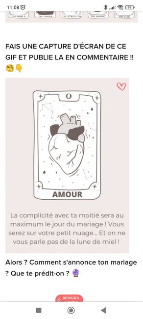 Coucou tout le monde 💜 Merci d'avoir participé jusqu'au bout ! Maintenant qu'on en sait un peu plus sur ton mariage, on va pouvoir tirer les cartes... FAIS UNE CAPTURE D'ÉCRAN DE CE GIF ET PUBLIE LA EN COMMENTAIRE !! 🧐👇 Alors ? Comment s'annonce ton...