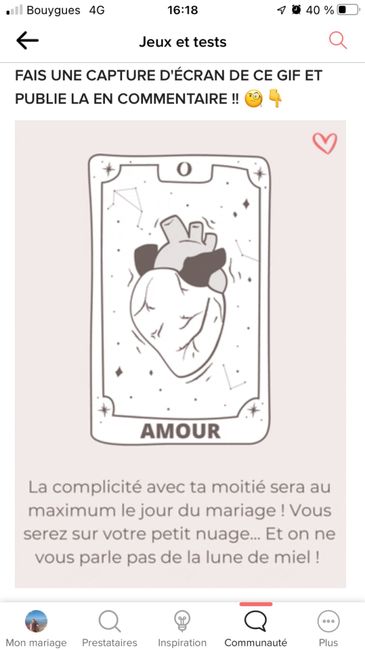 Coucou tout le monde 💜 Merci d'avoir participé jusqu'au bout ! Maintenant qu'on en sait un peu plus sur ton mariage, on va pouvoir tirer les cartes... FAIS UNE CAPTURE D'ÉCRAN DE CE GIF ET PUBLIE LA EN COMMENTAIRE !! 🧐👇 Alors ? Comment s'annonce ton...