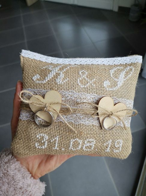 Coucou 👋 J'ai ma super témoin qui m'a brodé mon coussin pour les alliances, J'adore ! 😍 J'ai juste peaufiné Avec la ficelle et les cœurs en bois. Le résultat que j'attendais je suis ravie 😊