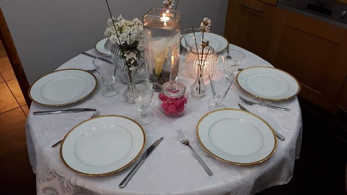 Coucou tout le monde !! Qu'en pensez vous de ma déco de table ? Sachant que c'est un premier essais et que le jour j ce sera des tables de 8 ou 10 personnes et que les fleurs ne seront pas celle la, il manque aussi la grosse bougie flottante dans le...