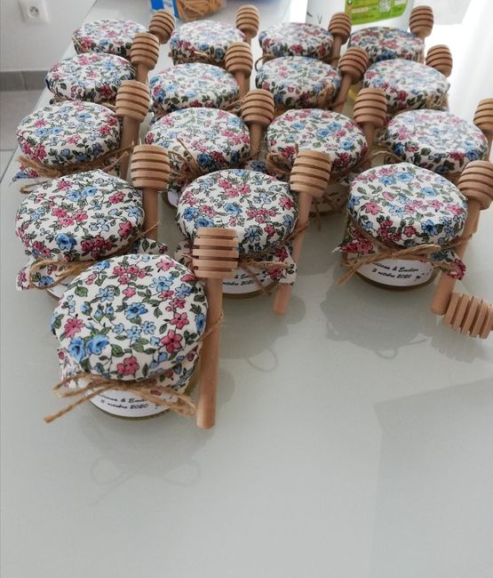Coucou à toutes les FM, Voici nos cadeaux invités réalisés par nos soins. Petit pot de 🍯 recouvert d'un joli tissu fleuri et d'une petite cuillère.Notre mariage étant le 03 Octobre 2020 tout s'accélère.Bon courage à toutes celles pour qui le grand...