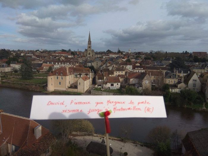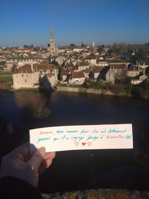 Bonjour les futurs mariés !!! Aujourd'hui je compte sur notre belle communauté pour me préparer de beau love note. La phrase étant : L'amour de Beverly pour Damien est si fort qu il a voyagé jusqu'à ... (Votre ville ou pays) Pour ce qui ne connaisse...