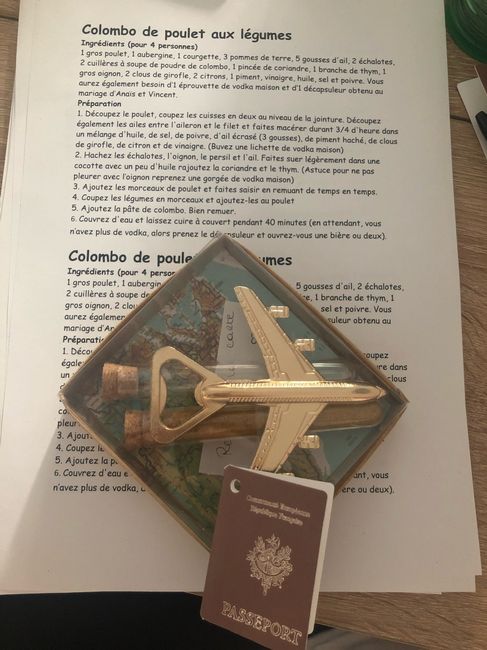 Voilà’ la suite des cadeaux pour les invités, (et c’est pas fini) éprouvette avec des épices à colombo et un décapsuleur avion pour coller à notre thème voyage il ma que l’éprouvette de vodka orange faite maison accompagné de la recette personnalisé...