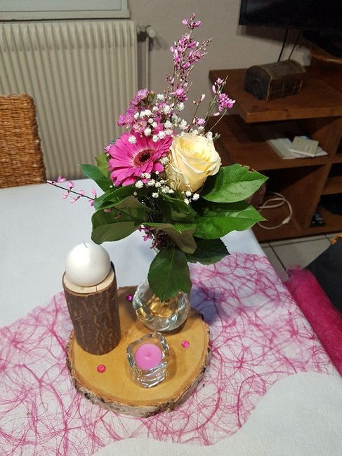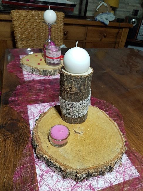 Cc les filles , Pouvez vous m aider , quelle genre de vase ou bouteille voyez vous sur mon rondin en bois , avec ou sans bougies MERCI (thème champêtre et fuschia avec des orchidées )