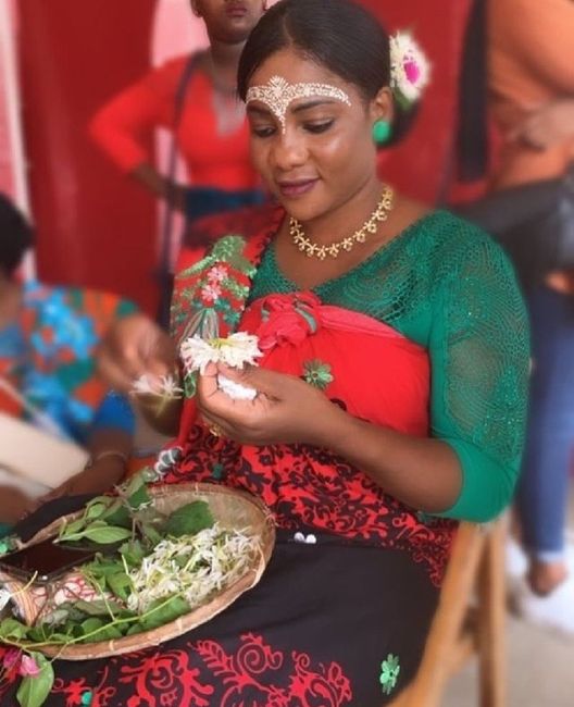 Hello, je vais me marier dans les îles cette été et j'aimerai porter une tenue avec du tissu traditionnelle pour une des cérémonies qu'en pensez vous ( avec les fleurs de jasmin sur les cheveux et le petit "tatouage" au msindanu, c'est assez typique...