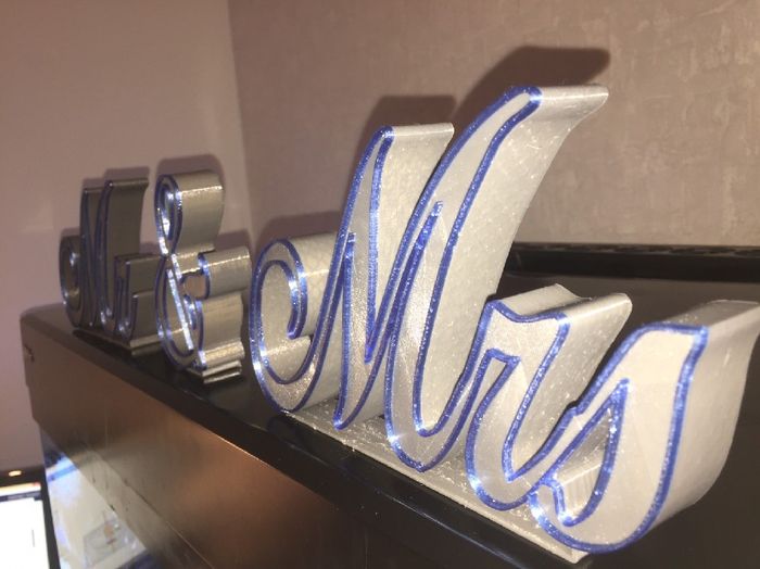 Coucou, je vous montre le dernier DIY réalisé par mon homme avec l'imprimante 3D. Je le trouve magnifique !!!! "Mr & Mrs" que l'on va mettre sur la table de l'urne et du livre d'or. Mon chéri l'a fait en bicolore bleu et gris (nos couleurs sont...