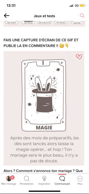 Coucou tout le monde 💜 Merci d'avoir participé jusqu'au bout ! Maintenant qu'on en sait un peu plus sur ton mariage, on va pouvoir tirer les cartes... FAIS UNE CAPTURE D'ÉCRAN DE CE GIF ET PUBLIE LA EN COMMENTAIRE !! 🧐👇 Alors ? Comment s'annonce ton...