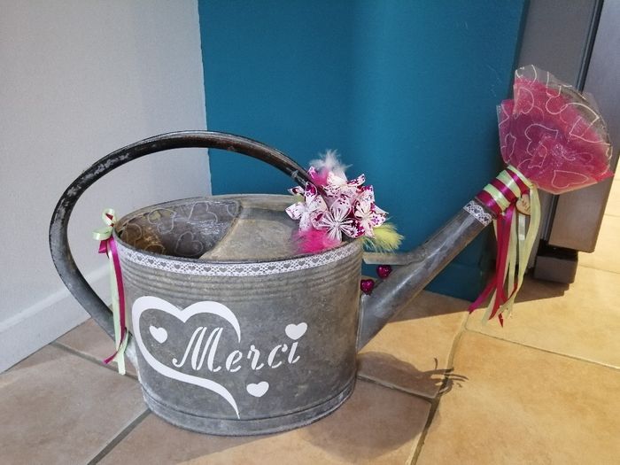 Il y a 2388 joursje viens de finir notre urne simple mais original Notre thème champetre avec du fuschia et du vert anis et toujours mes fleurs en origami pour faire un rappel à mon bouquet 😊