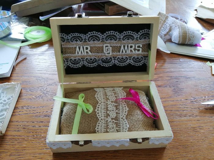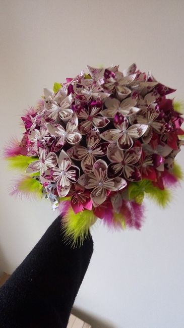 je viens de finir notre urne simple mais original Notre thème champetre avec du fuschia et du vert anis et toujours mes fleurs en origami pour faire un rappel à mon bouquet 😊