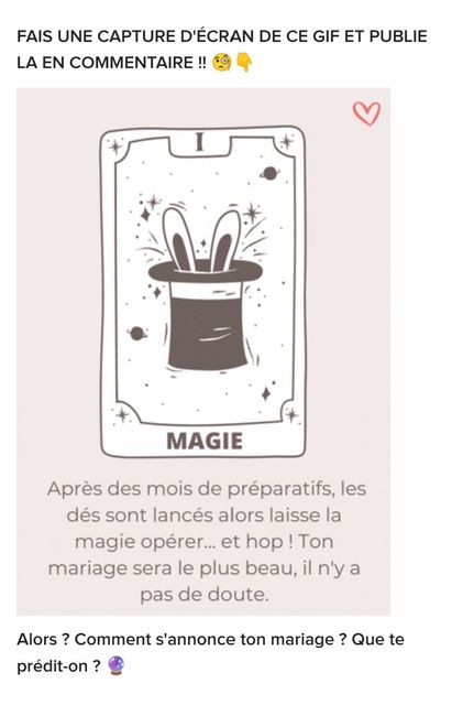 Coucou tout le monde 💜 Merci d'avoir participé jusqu'au bout ! Maintenant qu'on en sait un peu plus sur ton mariage, on va pouvoir tirer les cartes... FAIS UNE CAPTURE D'ÉCRAN DE CE GIF ET PUBLIE LA EN COMMENTAIRE !! 🧐👇 Alors ? Comment s'annonce ton...