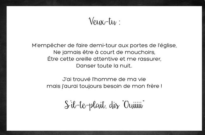 Demande témoin Demande de témoin Bonjour la commu ! ça y est j'ai fais mon choix pour mes témoins. Je vais demander à mon frère et à ma meilleure amie. Je voulais partager avec vous la façon dont je vais leur demander. Une petite carte...