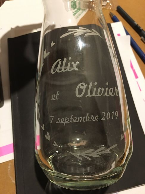 Je suis toute contente de vous présenter mes carafes à eau personnalisées ! Ce sera uniquement pour la table d’honneur. Les autres tables auront des bouteilles de recup en verre avec seulement la couronne en plus petit ( ça me permettra de réutiliser...