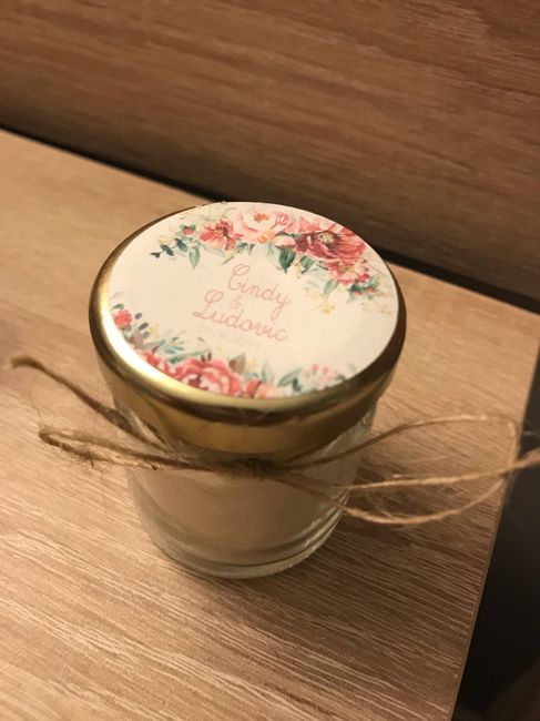Coucou les futures mariées ! Je partage avec vous nos cadeaux d’invités que nous avons reçus, fait par latelierdesoizic.fr bougies personnalisées au monoï pour nous. Temps de livraison un peu long mais très bonne adresse ! 😊