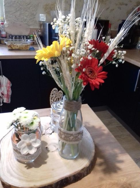 Coucou tout le monde! 1er test de centre de table - Mon mariage est sur le thème champêtre - je pense à un chemin de table en toile de jute avec un peu de mousse sur le dessous du rondin de bois. Et bien évidemment le blé sera du vrai (merci le champ...