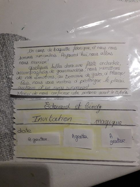 Bonjoir tout le monde Je fais des brouillons de faire part. Notre theme est la magie et le chocolat, donc marron et doré. Nous avons un magicien qui viendra au cocktail et repas. Mes faire parts sont sur un fond doré, on voudrait faire comme le...