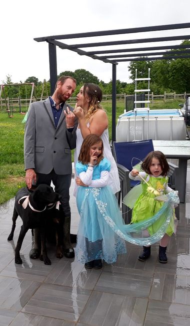 Nous nous sommes échangés nos anneaux (pas les vrais bien sur) aujourd'hui a la date prévue dans le jardin sous le regard de nos chiennes, sous les baguettes magiques de nos filles et sous le crachin breton 😅 Nous avons filmé la scène et nous ferons...